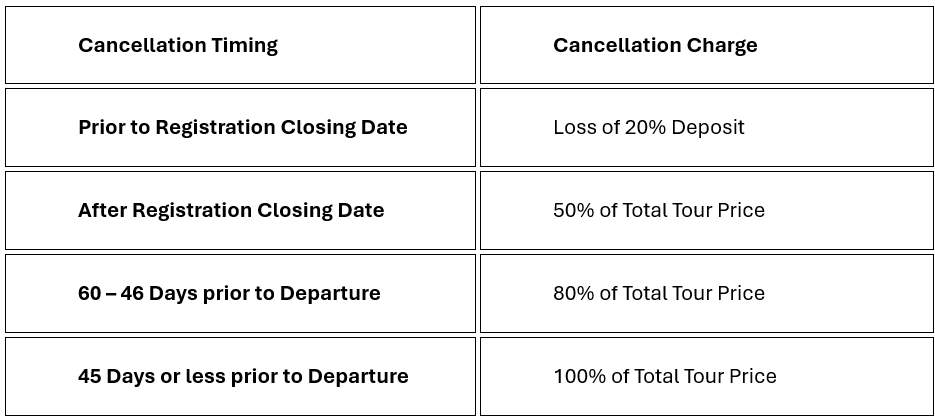 Requests for cancellation must be submitted in writing. Due to the exclusive nature of group departures and non-refundable commitments made to suppliers months in advance, the following charges apply: